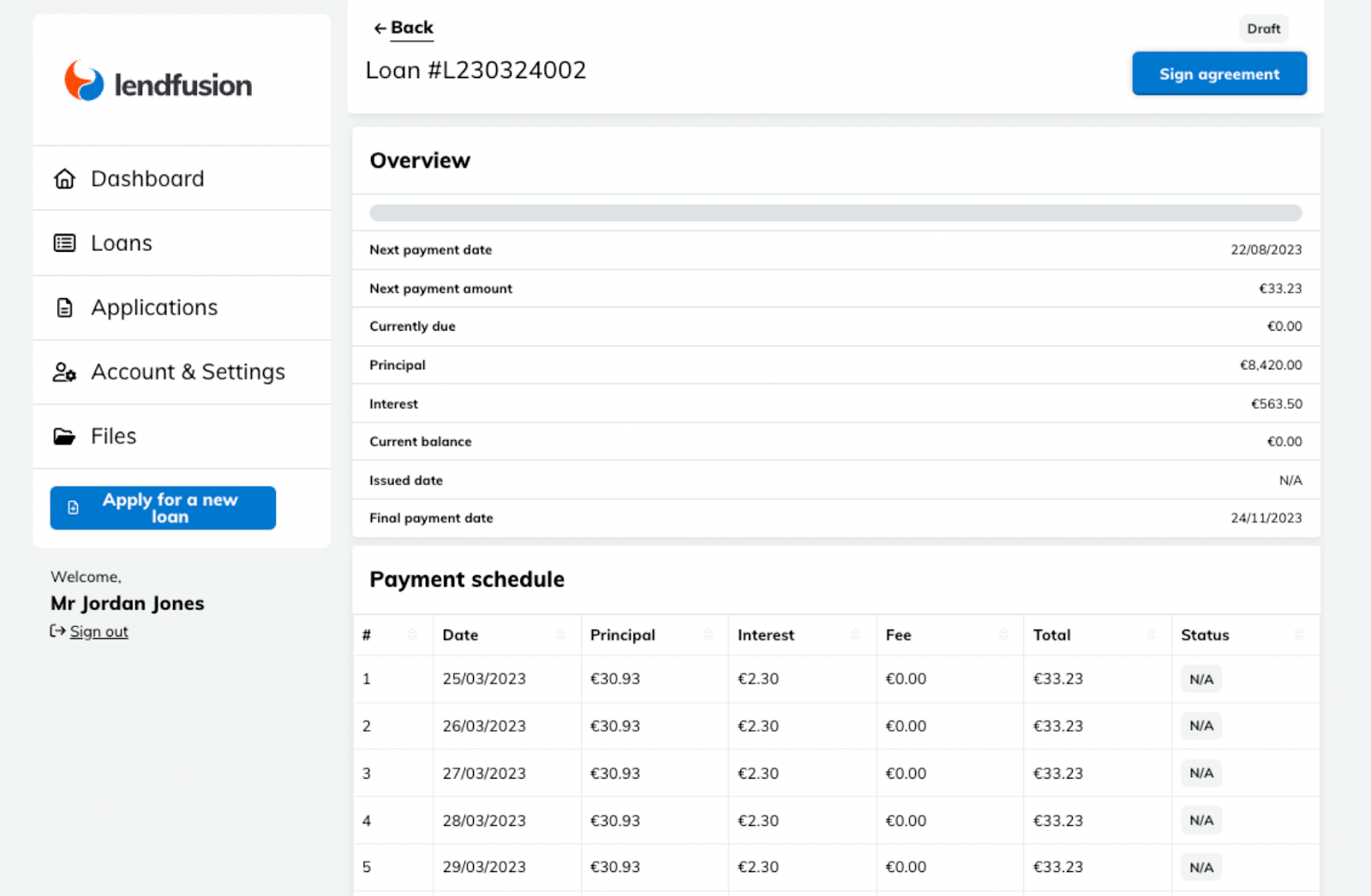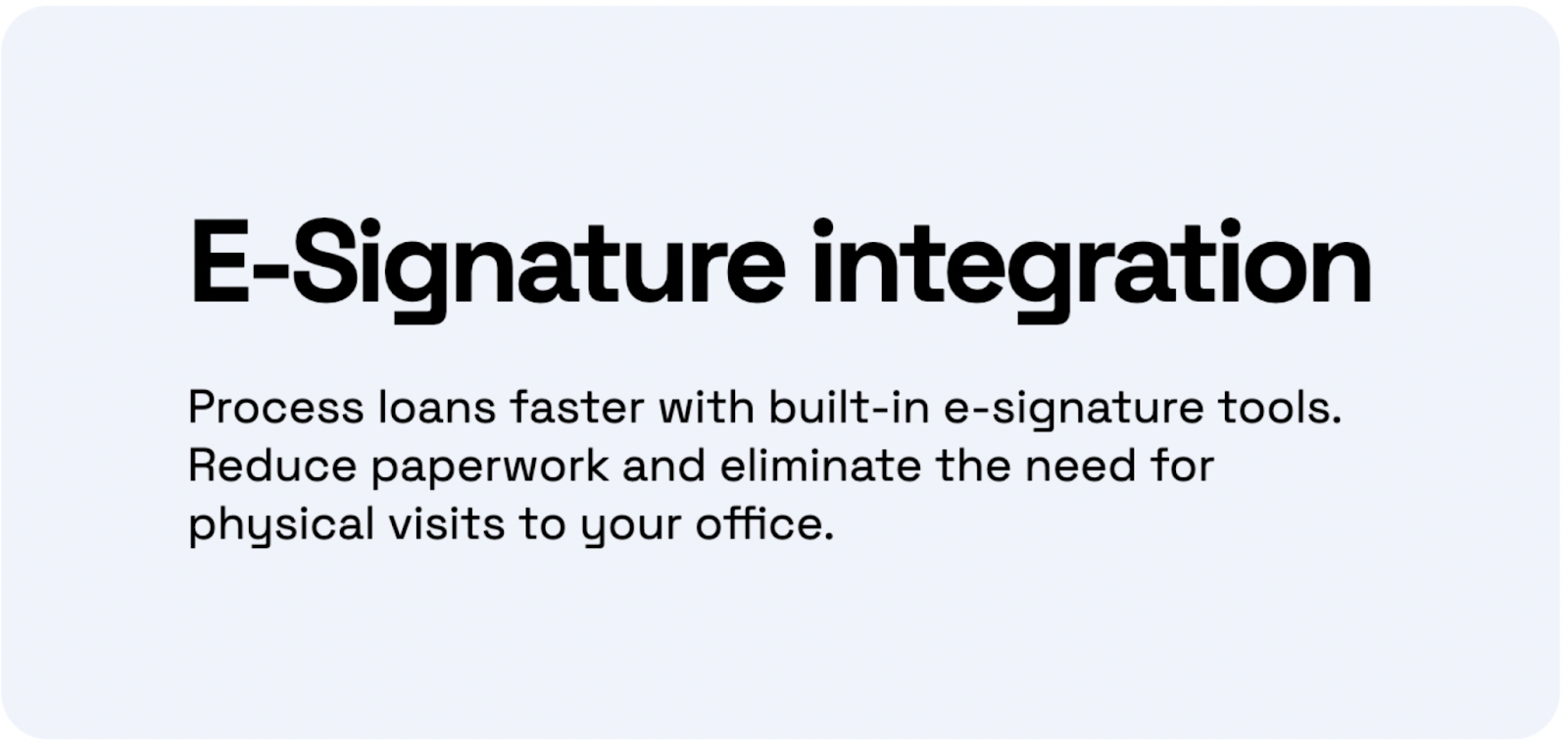 After acceptance, a loan agreement is generated and must be signed. E-signature capabilities embedded in the lending workflow remove the need for physical paperwork, dramatically accelerating this step – particularly important for digital-first consumer lenders.