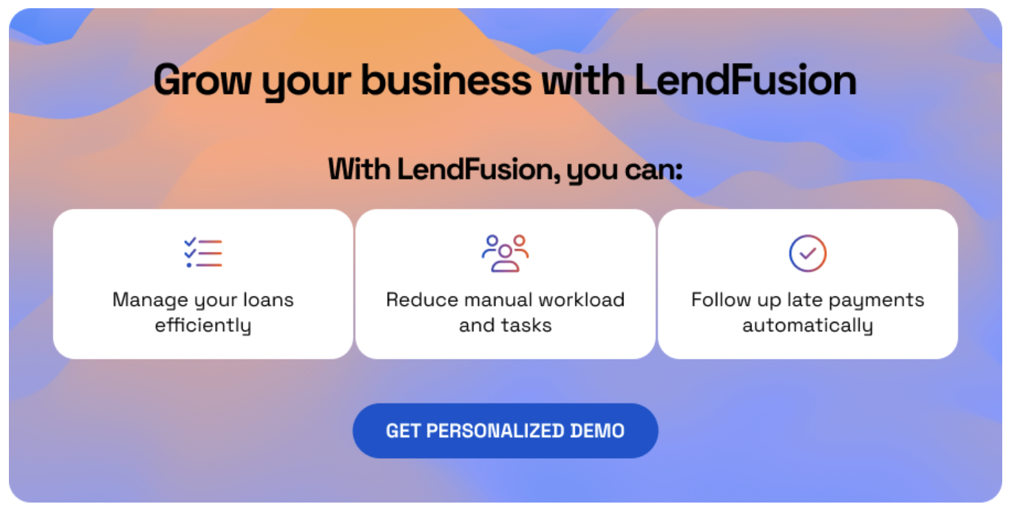 LendFusion’s loan payment processing feature is designed for lenders, just like you, to achieve more, with less. Book a demo of LendFusion today to automate the entire lending process – from loan origination to loan servicing.