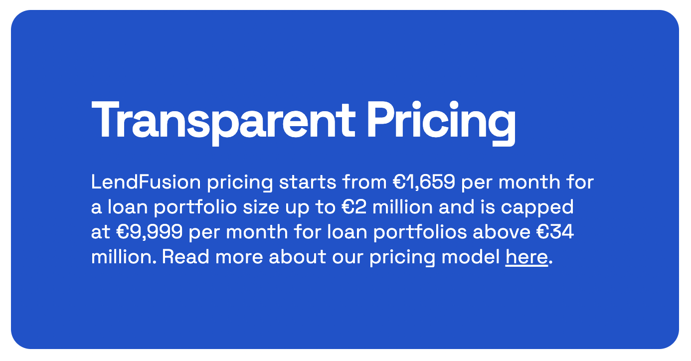 LendFusion pricing starts at €1,659 per month – with unlimited users – making it ideal for established lenders. This is in comparison to a comprehensive solution like HES FinTech’s LoanBox, where pricing ranges from €20,000 to €70,000.